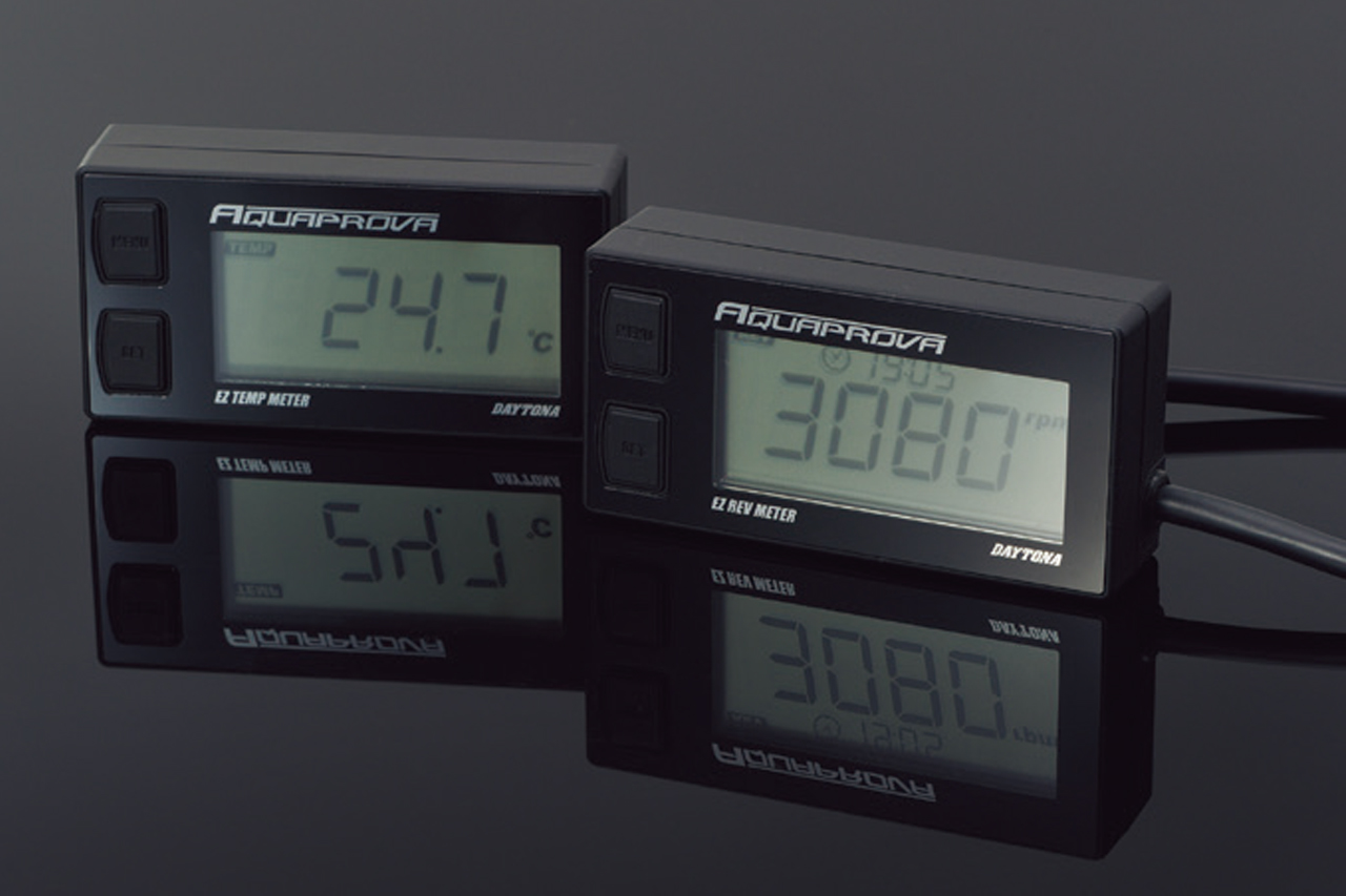 IPX7相当の防水性能や時計機能、最高値メモリー機能などを搭載したアクアプローバメーター。こちらは通常液晶(グレー)のタイプで、電池駆動なので取り付けが簡単となっています