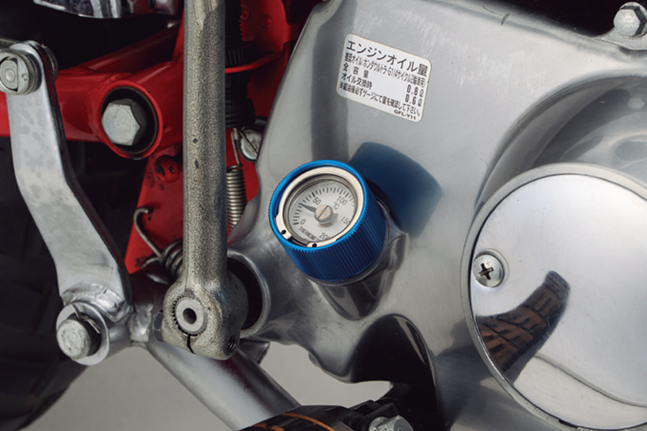 純正オイルフィラーキャップと交換するだけで油温を確認できます。油温表示は0℃〜200℃で、オイルレベルゲージ付きでクロームメッキ、ブルーから選ぶことができます