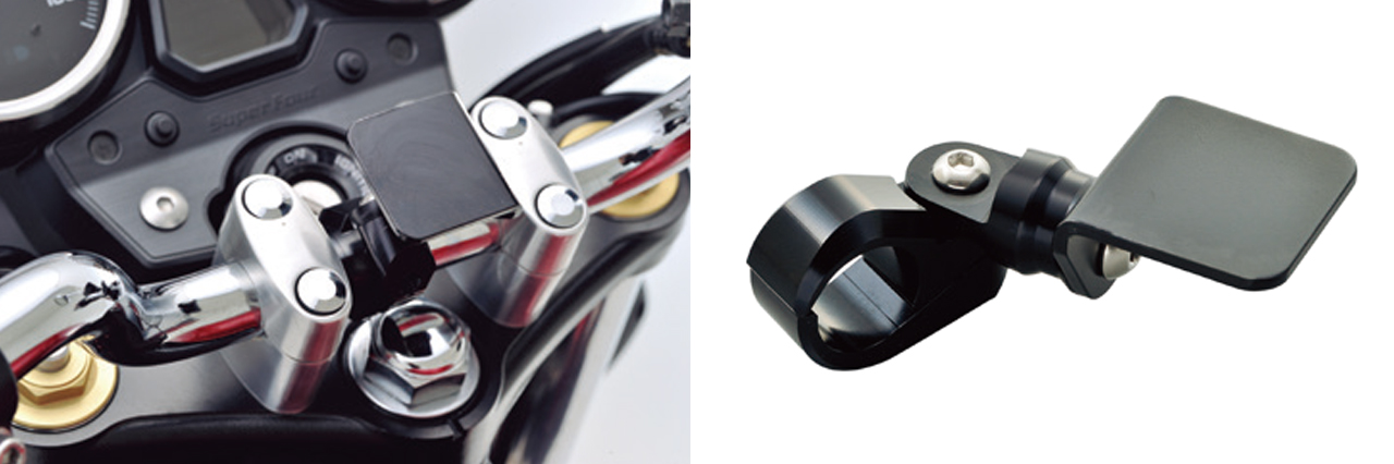 フラットな座面でコンパクトなメーターや時計などをハンドルに貼り付けることができるブラケット。3軸の角度調整が可能でさまざまなハンドル角度に対応してくれます