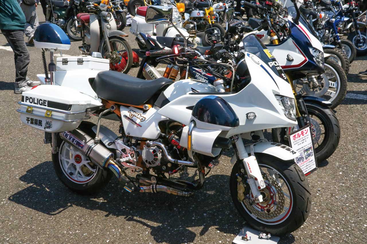 モンキーミーティングではおなじみとなっている白バイ風カスタム。カウル類にはCB風のデザインパーツを使用。エンジン周りにもかなり手が加えられていて、オーバーのダウンマフラーを装備。さらにブレーキはブレンボでナイトロンのモノサス装備のプロアームを採用と徹底している