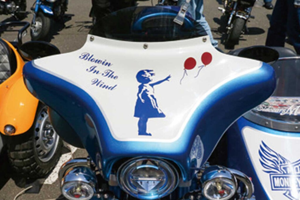 エムクラフトのTS1サイドカーを装備したモンキー125。大型フェアリングにトップボックス、サイドボックスを装着したスタイルは、まさしくミニハーレーサイドカー。ブルー/ホワイトのカラーリングも美しく、バンクシー作品を模したグラフィックもユニークで注目を集めていた
