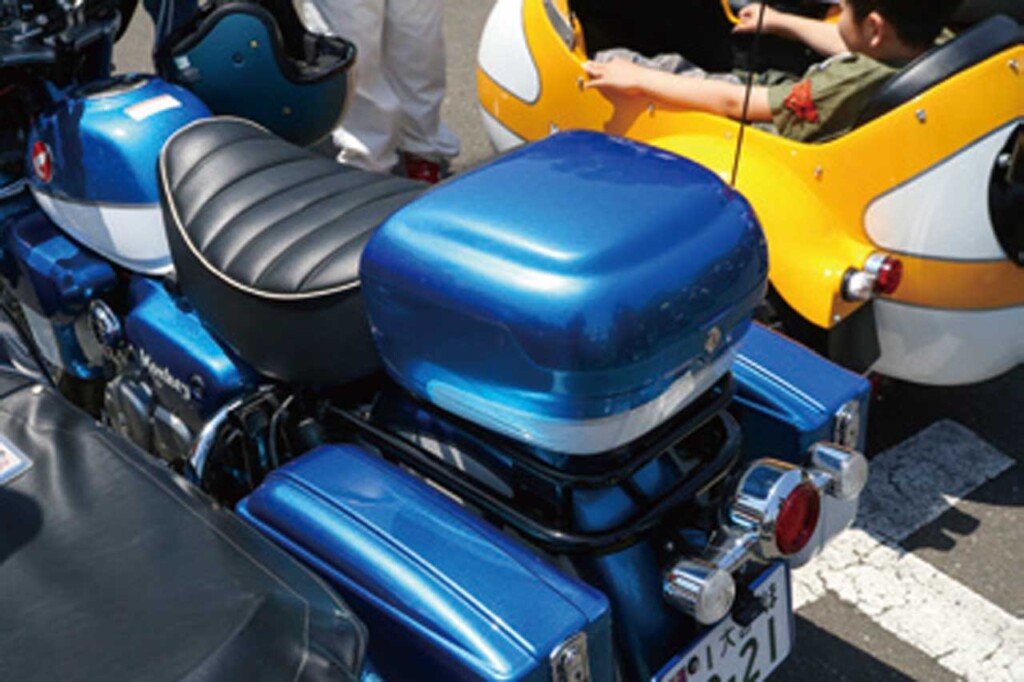 参加しているモンキー125の多くは、少なからずカスタムしている。しかしノーマルに近いモデルも見かける。写真のモンキーは、赤いボディに合わせたチェック柄のシートを装着しているほか、JR貨物のコンテナをイメージしたリアボックスを装備するのみだ