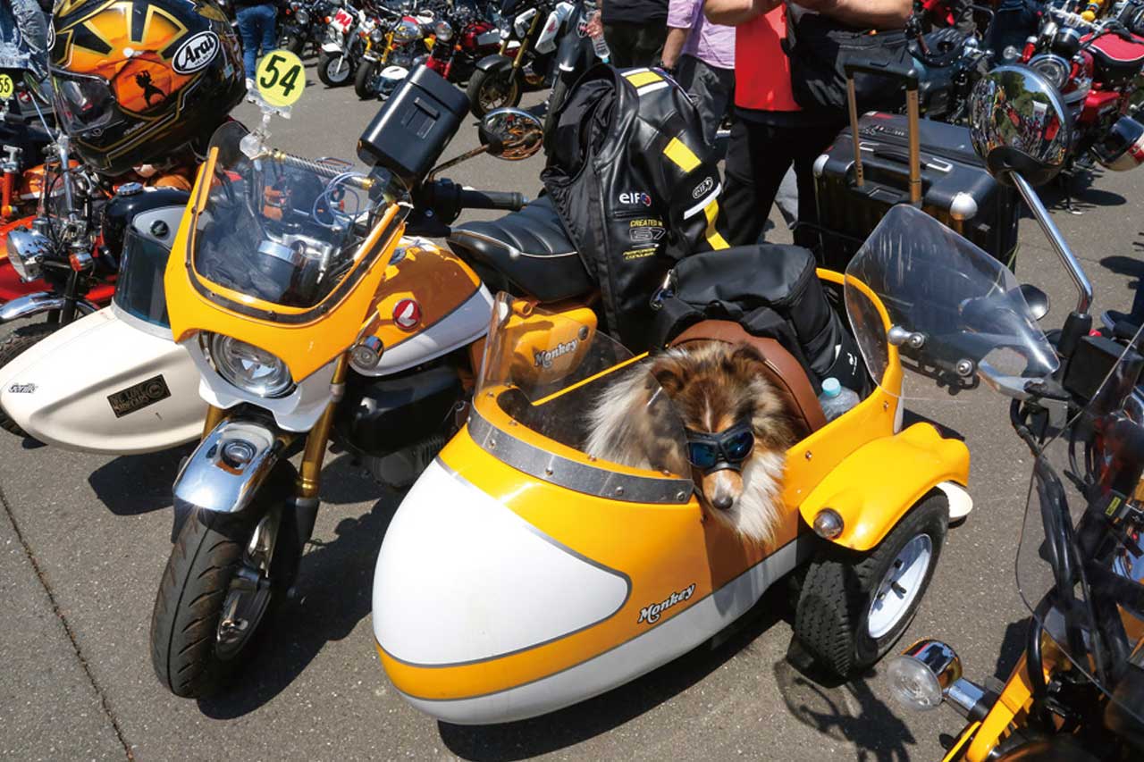 エムクラフトTC2サイドカーにゴーグルを装着した愛犬がちょこんと乗った姿は参加者に大人気。イエロー/ホワイトにカラーリングされた125モンキーには、ユニークな装備が随所にあり、オーナーの愛着ぶりがうかがえる