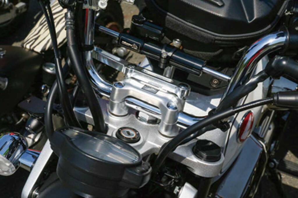 アクラポビッチ2本出しチタンアップマフラーをはじめ、足周りの強化などでカスタムしたモンキー125。細部に至るまで吟味されたパーツを組み込んでいる