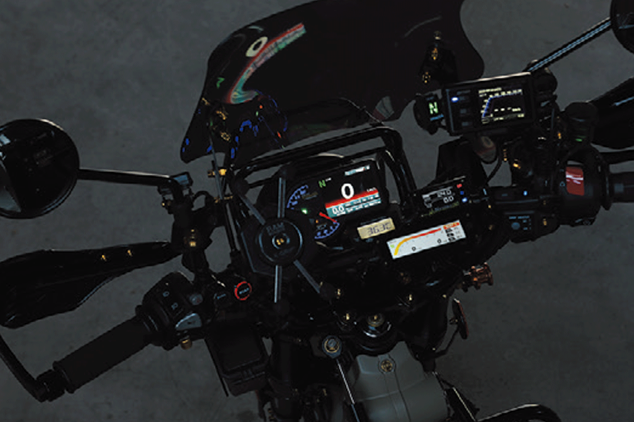 武川製メーターはOVER製ステムに付属するステーで取り付け可能。排気量アップに伴いaRacer製フルコンでECUを制御している。これはワイドバンドセンサーによる空燃比などの確認も可能