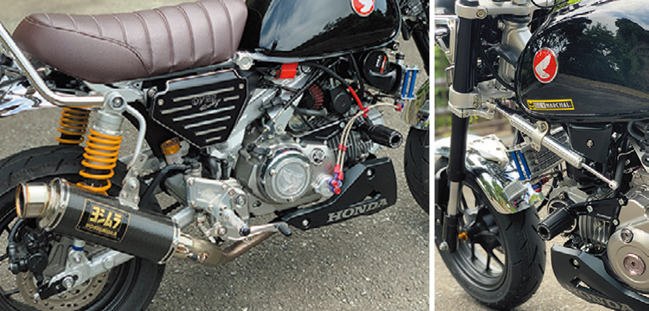 各パーツは極力モノトーンを基調にしながらも、なるべく地味にならないように配慮した。バックステップはOVER製だし、タイヤにはダンロップTT93GPを入れるなど、初カスタムとは思えない玄人セレクトです! ステアリングダンパーはMINIMOTO製。アンダーカウルはポン付けが可能な現行グロム(JC92)の純正オプションだ。
