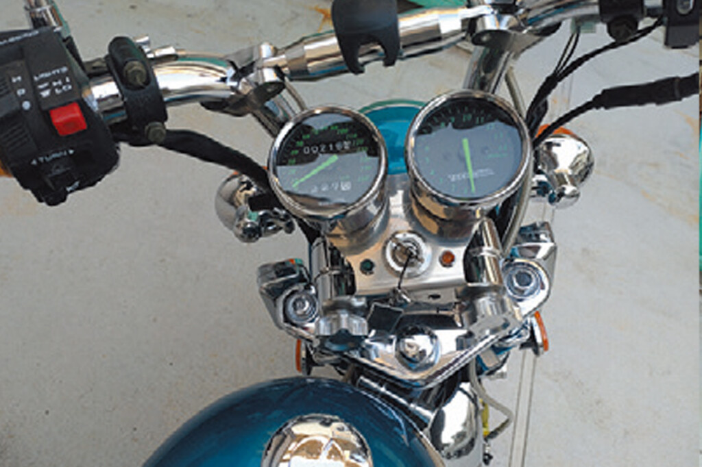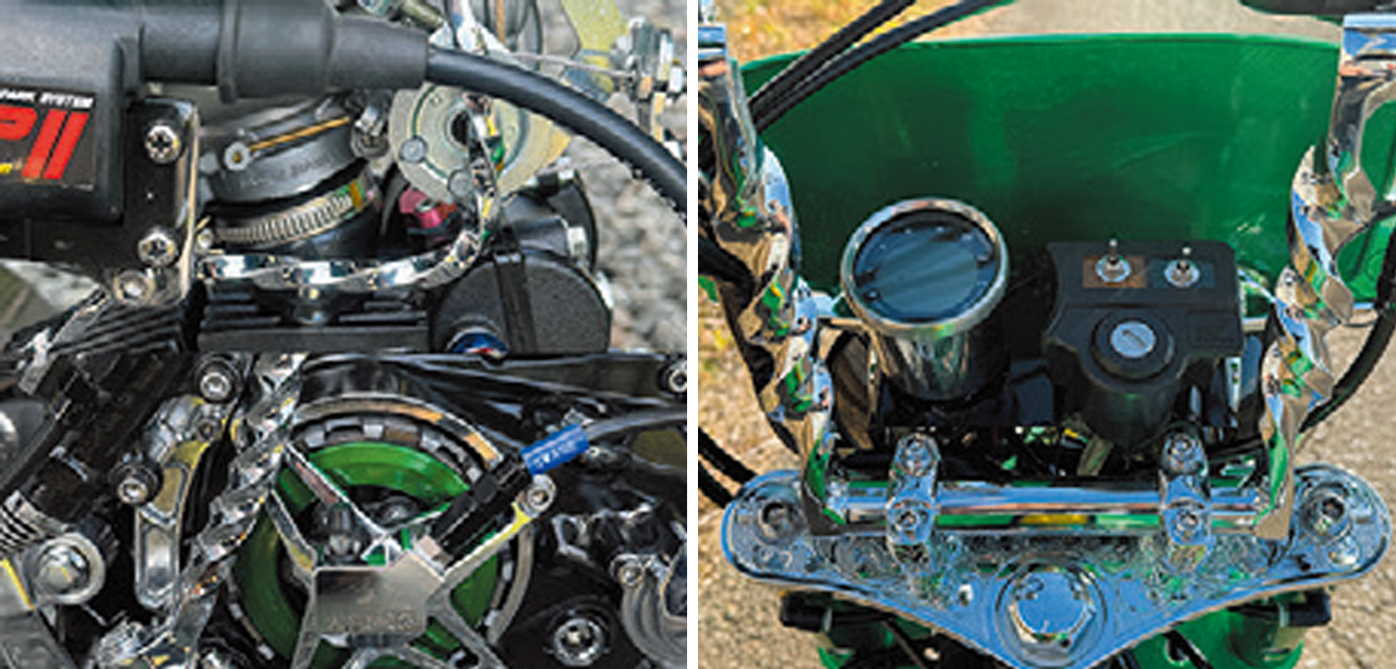 ハンドルや左右ペダル、キックペダル、ウオタニコイルステーなどなどワンオフツイストしまくり。更に各部はメッキ仕上げでギンギラギンにさり気なくない。フレームは4センチロング加工してヘッドとタイヤにクリアランスに余裕を持たせ、大きなキタコ製DOHCヘッドも楽に収めた124cc。エングレービングやエッチング加工も◎だ