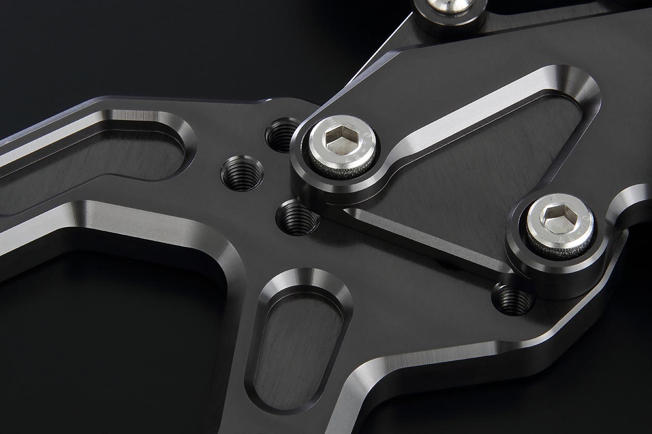 レースを前提としているため、フットペグの調整幅が大きく、後方に55.5/65.5mm、上方に66/76mmの4パターンを設定。これにより深いバンク角とアグレッシブな乗車姿勢を実現する。軽量・小型化を追求した独特の形状や、ホールド性と操縦性を高める一体型プレートも同社ならではの造形だ。