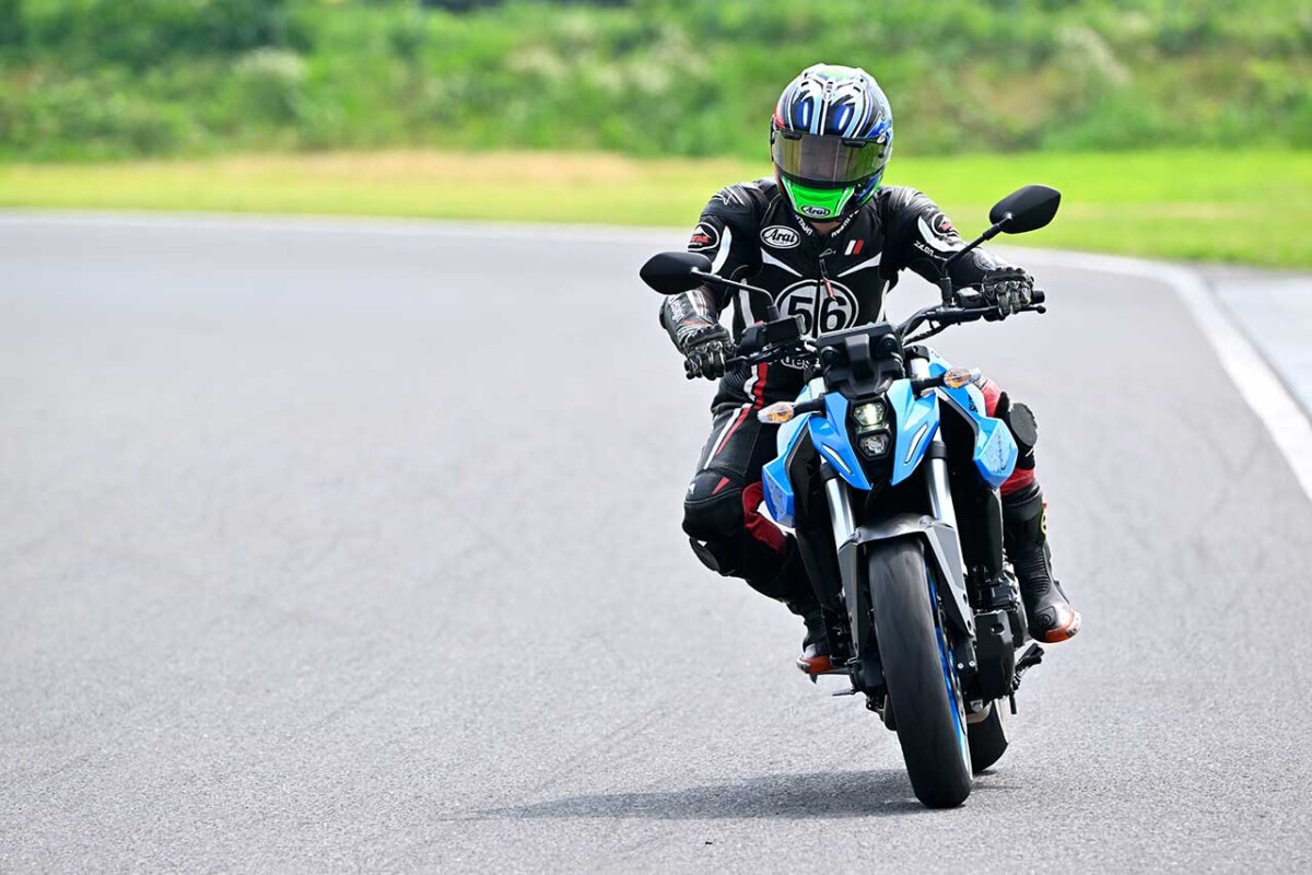 そして、もっとも強く曲げたい地点まで寄せていき、到達したところでブレーキをリリース。これをきっかけに車体をバンクさせる。バイクは、フロントブレーキをかけると起きようとする。逆に、それまであった入力をキャンセルすることで、バンクさせやすくなるのだ。
