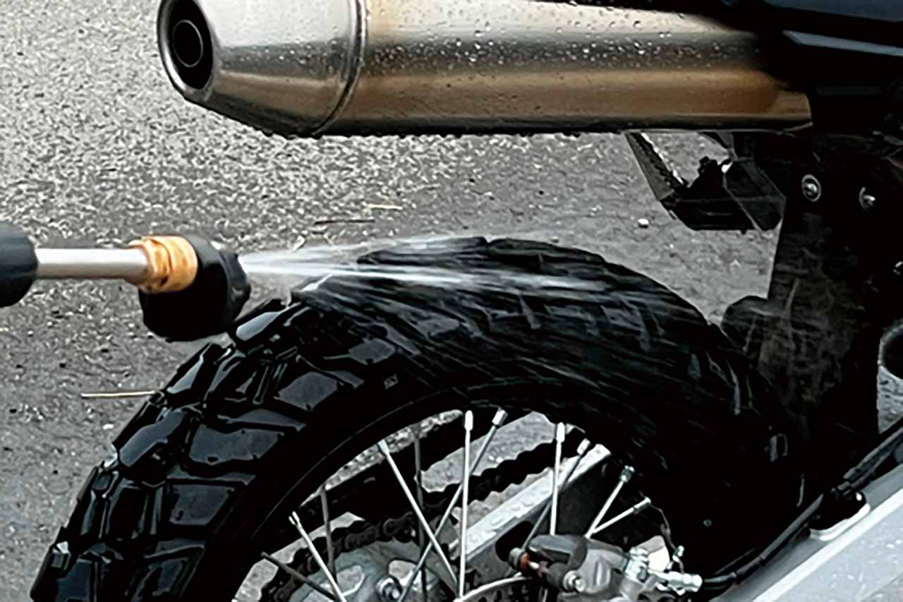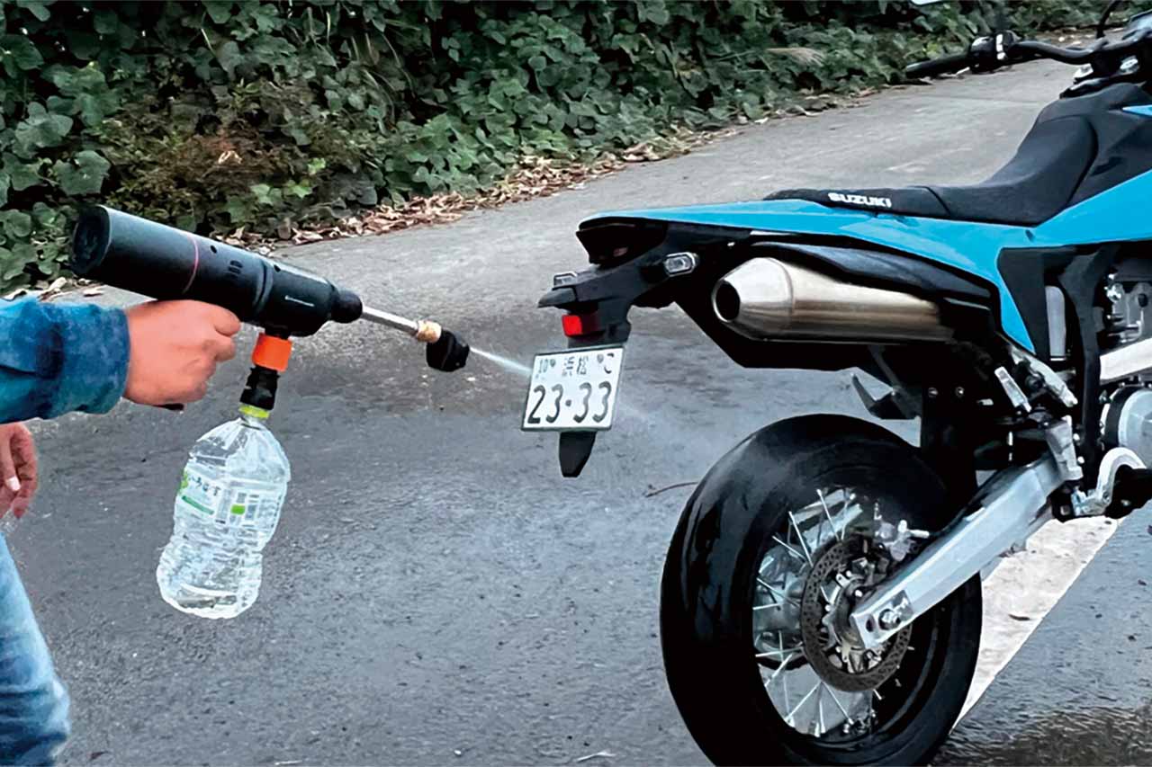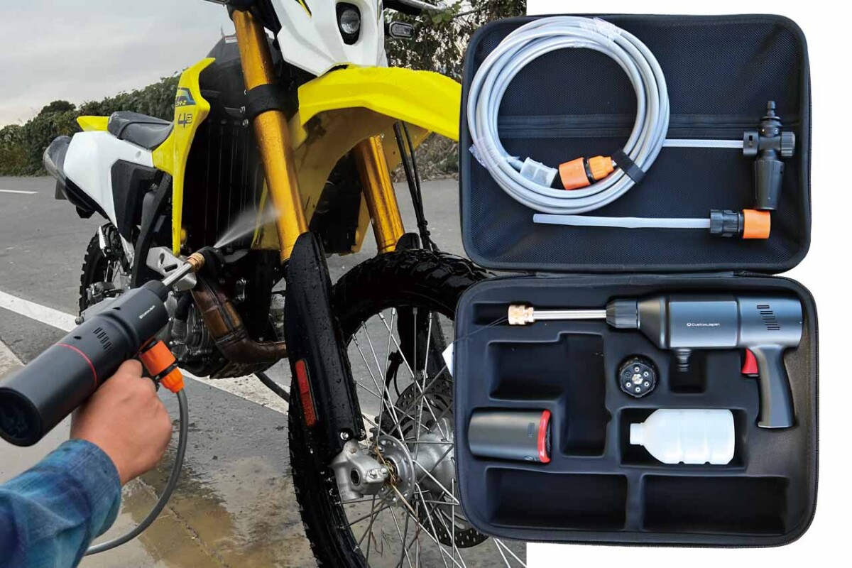 バイクやトランポの洗車はもちろん、パドックテントの洗浄、簡易シャワーとしても活躍する。水道がない駐車場や林道主体のトレールライダー、レース後でも即洗浄できる便利アイテムだ。