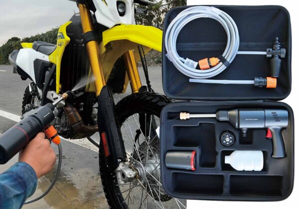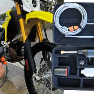 バイクやトランポの洗車はもちろん、パドックテントの洗浄、簡易シャワーとしても活躍する。水道がない駐車場や林道主体のトレールライダー、レース後でも即洗浄できる便利アイテムだ。