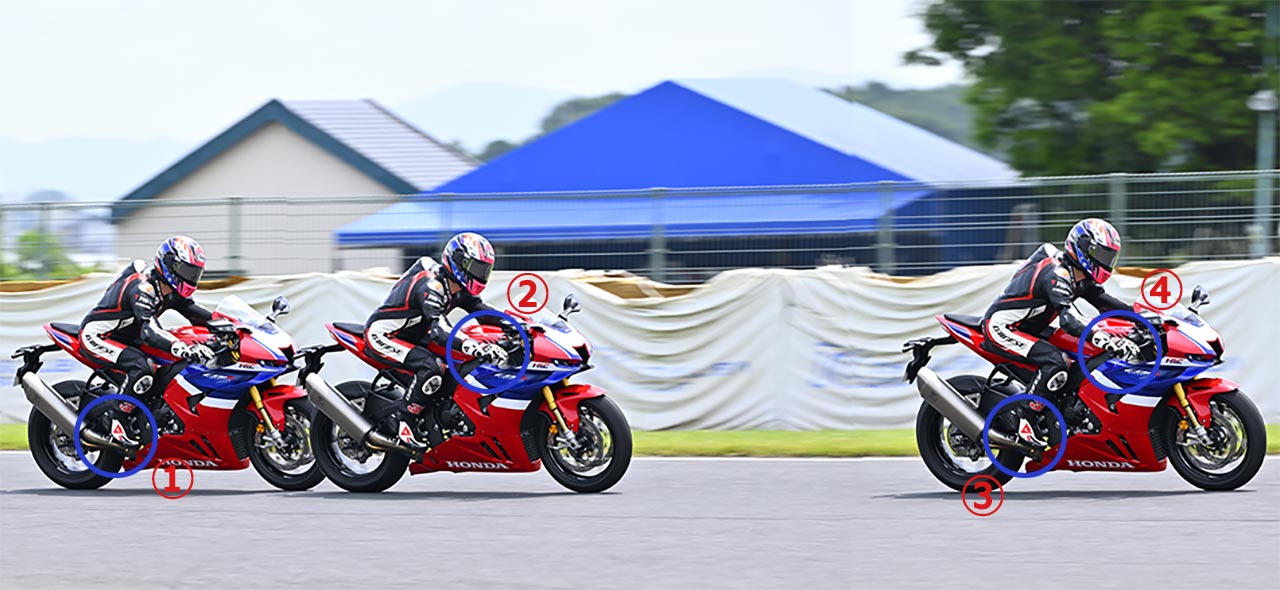このように話す原田さんの操作を、下では3〜4段階に切り分けて解説している。とはいえ、連続写真の位置関係でもわかると思うが、各動作の切り替えはごく短時間で遂行されている。これを「えっと、まずはリアを踏んで、それからスロットルを戻して……」なんてやっていたら、鋭く安定したハードブレーキングにはまるでつながらず、それこそフロントブレーキだけを使うほうが上手に走れるかもしれない。