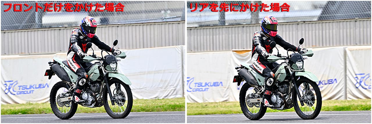 「大きなポイントは、まだスロットルを開けているうちに、リアブレーキを踏んでしまうこと。先にスロットルを戻してしまうと、そのタイミングでノーズダイブが起きはじめ、リアを沈める効果が薄れます」