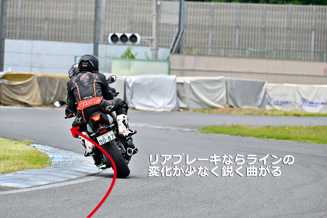 特に前後サスペンションのピッチングが大きめのバイクはリア重視が効果的。それ以外の車種でも、公道でリアブレーキの技術を磨くとサーキットで応用しやすい。