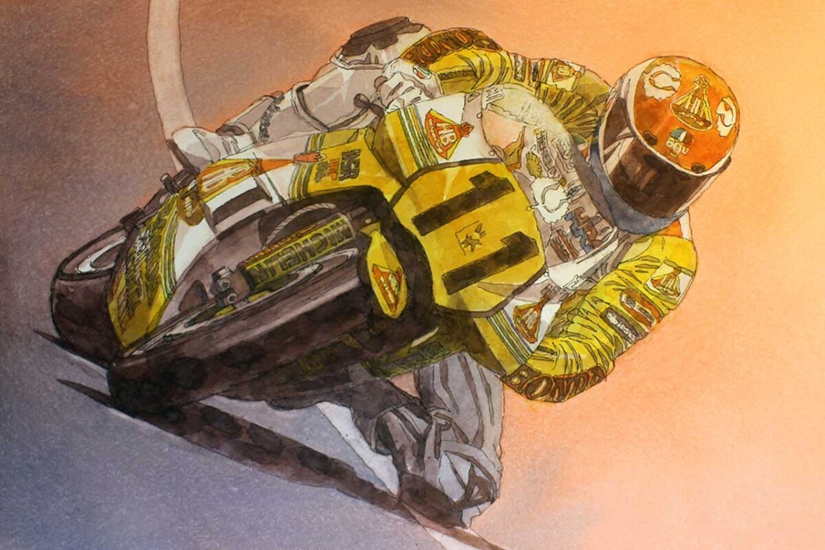 それはさておき、僕が最初にマッケンジーさんの存在を知ったのは、イラストに描いた’86年のこと。緑×白の噛みタバコメーカー・スコールバンディットカラーのスズキRGΓ500を駆る、手足が細くて長い細身のイギリス人という情報でした。その頃はテレビ放送は無かったので、『グランプリイラストレイテッド』という月刊誌からの情報です。