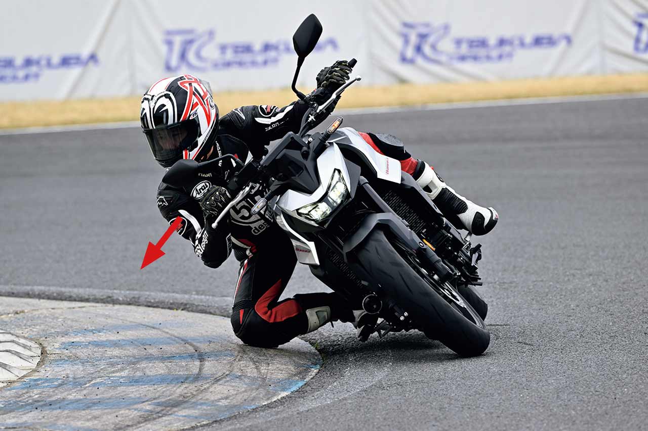 上手なライダーはこのとき、車体をさらにほんの少し寝かせ、一瞬の間にさらなる旋回力を引き出している。