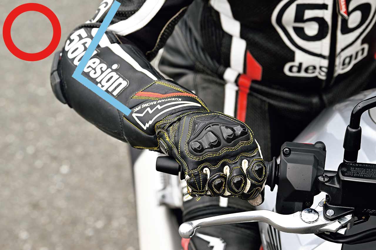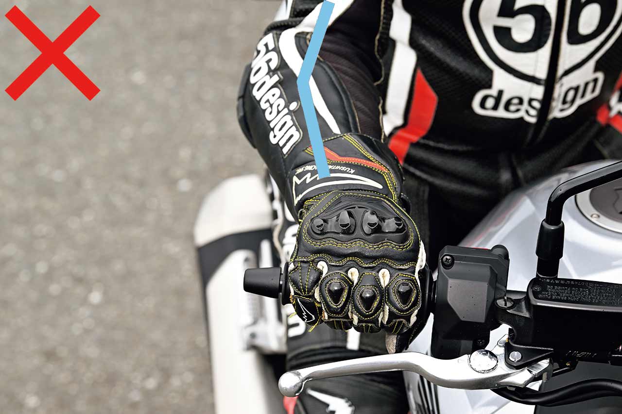 肩から直線的に腕を伸ばすのではなく、肘を軽く曲げて斜めから包み込むような意識を持ち、手のひらの小指側を中心にグリップを握ると、微妙なスロットル操作がしやすくなるのだ。