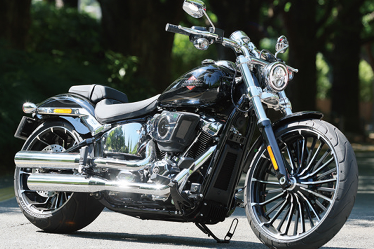 レイクしたフロントフォーク、低いシート高、大径フロントホイールと極太リアタイヤによるロー&ロングのフォルムが特徴的なブレイクアウト。ドラッグレーサーをストリートに落とし込んだカスタムスタイルで、まさに直線番長!迫力のあるスタイルで、クルーザーカテゴリーでも大人気のモデルとなっている。