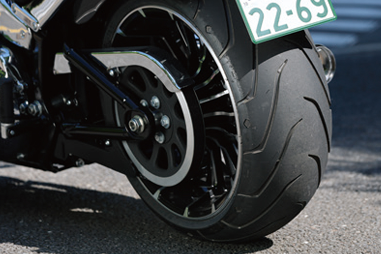 240mm幅のワイドなリアタイヤを装着。ハンドリングはよく、迫力の見た目と直進安定性を生み出す