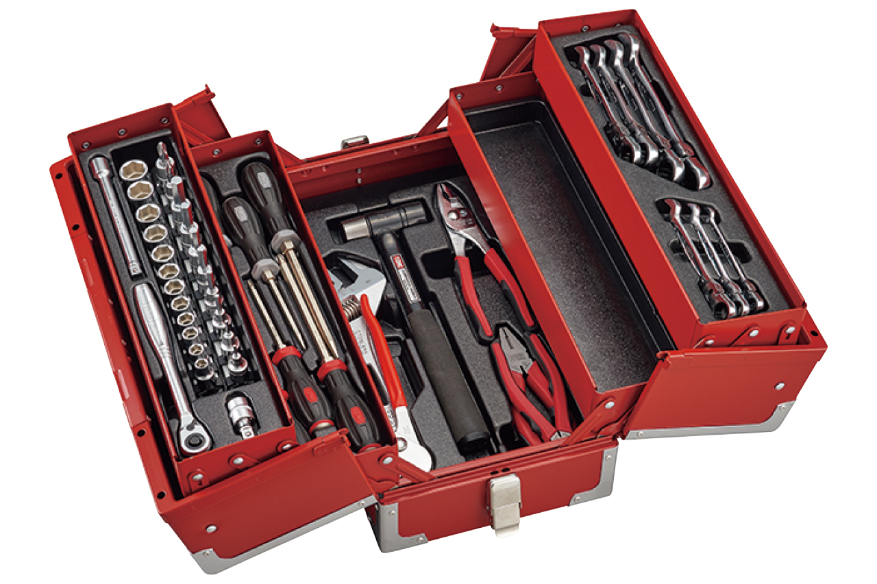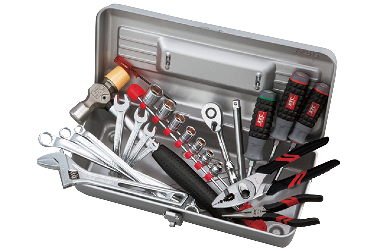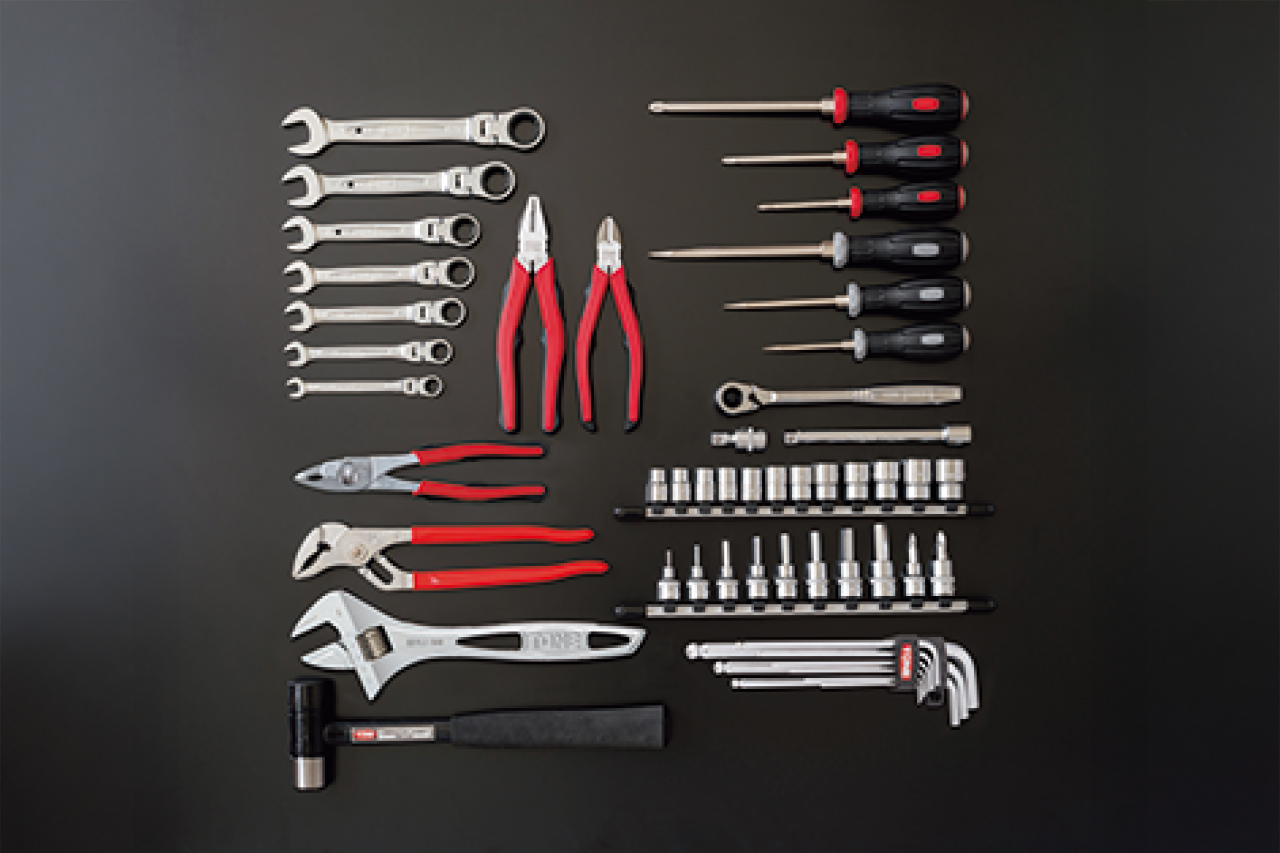 厳選した24点の工具をスタイリッシュなメタルケース「EK-5」に収めたセット。9.5sqソケットや90枚ギアのラチェットなど、整備作業の要を抑えた内容で、5.5㎏の軽量設計も魅力。作業効率と所有欲を同時に満たす、整備の第一歩にふさわしい工具セットだ