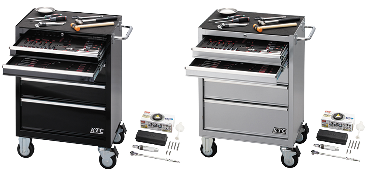 ローラーキャビネット(SKX3805)に工具(SK3721RXT)が入ったローラーキャビネットタイプの工具セット。作業を効率化させるロングスイベルラチェット、インパクトドライバセットを採用。自動車・バイクをはじめ、機械整備全般に使用できる
